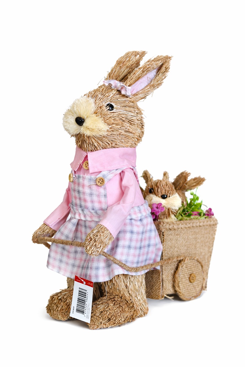 Com 37cm de altura, a peça possui presença marcante e acabamento cuidadoso, retratando uma coelha acompanhada de seus coelhinhos em um carrinho, transmitindo afeto, união e o espírito acolhedor da data. É perfeita para criar cenários temáticos cheios de charme e personalidade.