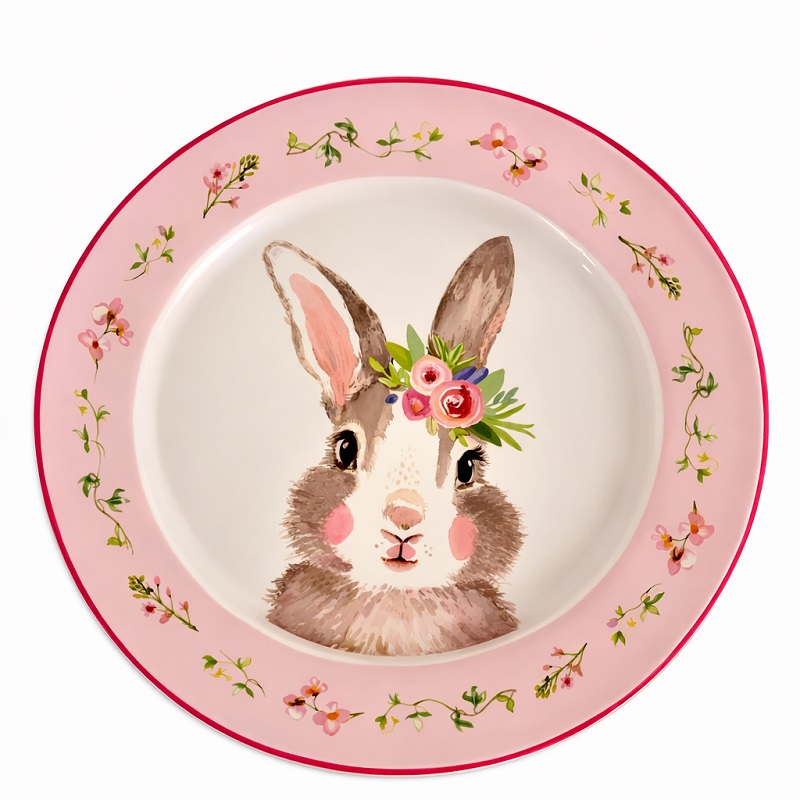 Com 27cm de diâmetro, possui tamanho ideal para servir refeições principais com conforto e apresentação impecável. A combinação do branco clássico com o rosa suave traz leveza e romantismo à composição, enquanto o detalhe do coelho adiciona um toque lúdico e encantador à decoração.